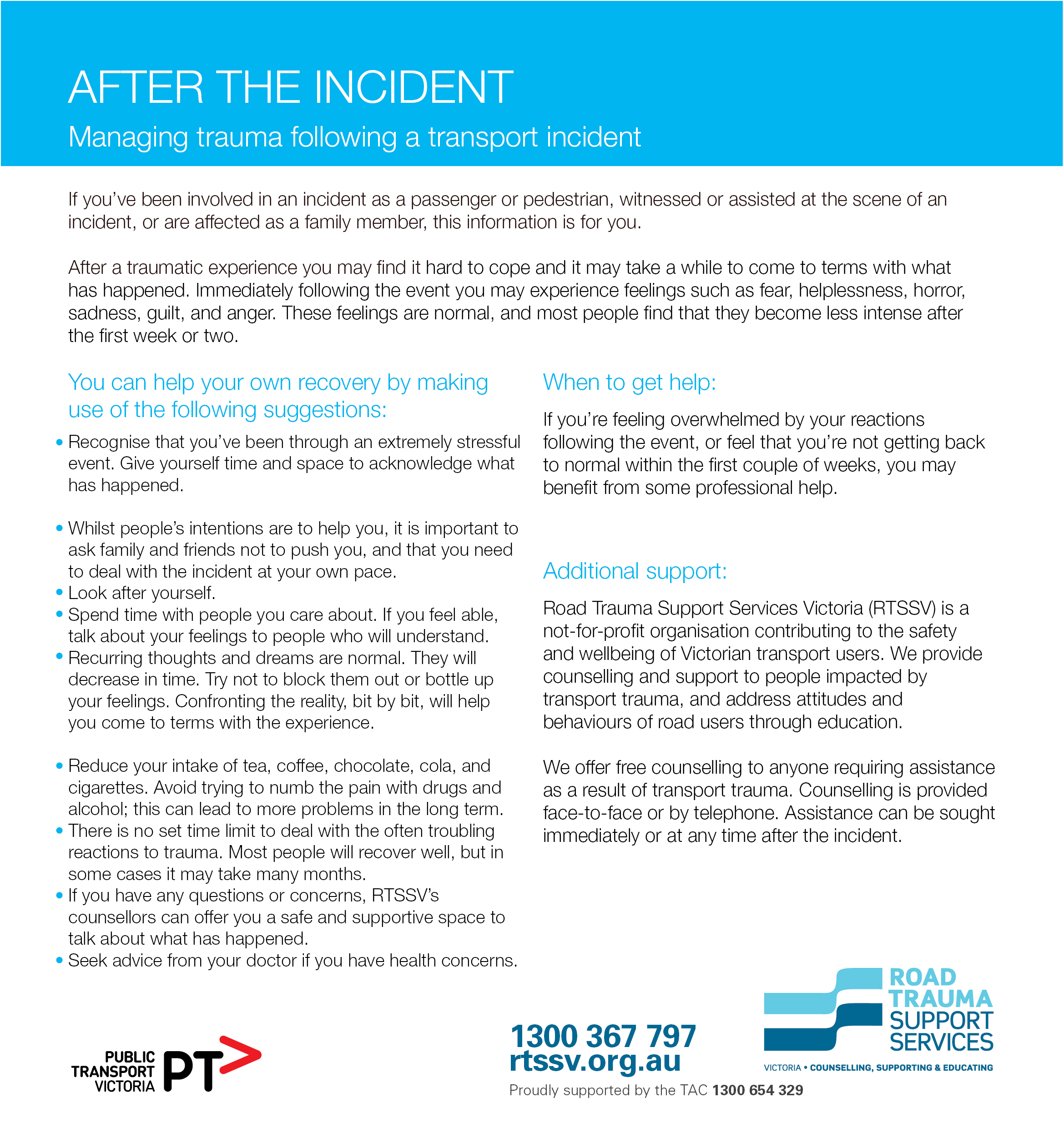 If you’ve been involved in an incident as a passenger or pedestrian, witnessed or assisted at the scene of an incident, or are affected as a family member, click here for further information.