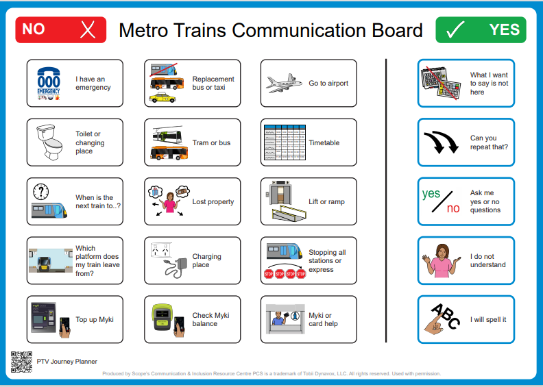 Metro has been accredited the Communication Access Symbol. The symbol signifies our commitment to provide accessible services for people with communication difficulty. Communication tools have been developed to help passengers and staff communicate about travelling on Metro. You can download and print the picture board tool by clicking the link below.
